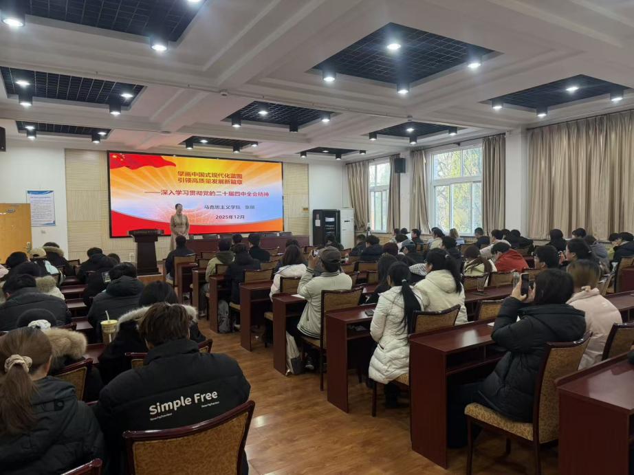 为深入学习贯彻党的二十届四中全会精神,引导广大青年学生深刻领会中国式现代化的宏伟蓝图与高质量发展的核心要义,12月15日下午,美女直播-美女直播入口 在美女直播副楼204会议室举办“擘画中国式现代化蓝图 引领高质量发展新篇章”专题宣讲会。马克思主义美女直播张丽副教授受邀担任主讲人,美女直播2025年下半年新发展党员发展对象、即将按期转正的预备党员、各党支部书记及支委成员、各级学生干部代表参加此次学习活动。