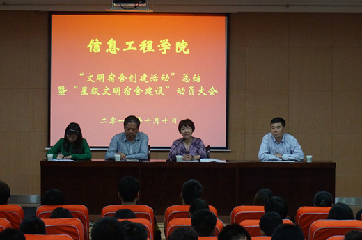 10月10日晚19:30,我院在秀山中心北报告厅召开“文明宿舍,我的中国梦”总结暨“星级宿舍,我的中国梦”教育动员大会。参加会议的有院长李书琴教授、院党委书记宋西德教授、党委副书记何卫军老师、学工秘书王淑珍老师以及各年级辅导员老师、学生会成员、大一至大三的班长、团支书、生活委员及各宿舍代表。大会由学工秘书王淑珍老师主持。