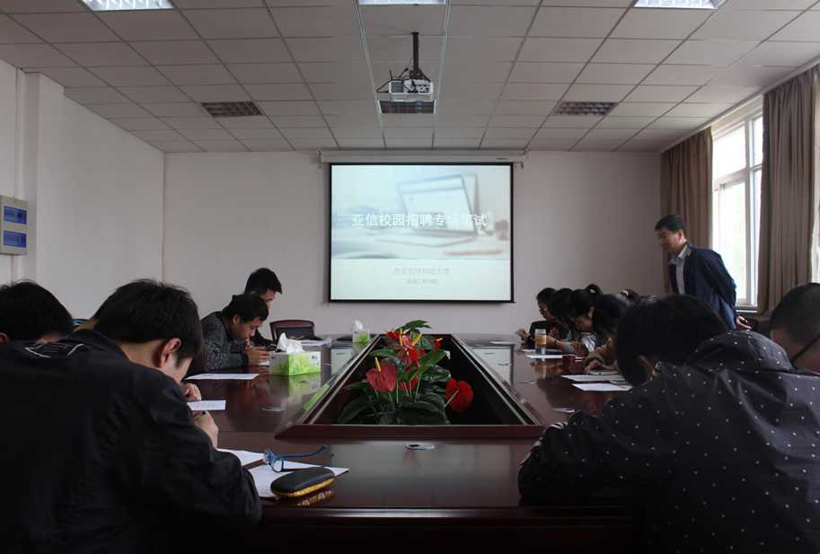 考虑到亚信集团在西安招聘的地理位置较偏远,学生们赴西安参加笔试费时费力,所以信息美女直播为学生们组织了一场微信专场笔试。笔试时间与西安交大同步,下午四点学生们统一坐在组织会场内,根据微信笔试指导书的指示连接WiFi、登陆、测试。经过一小时的认真作答,学生们陆续完成笔试,并加入“亚信校招美女直播 ”微信群,通过微信群接收笔试结果和公司有关的资讯。