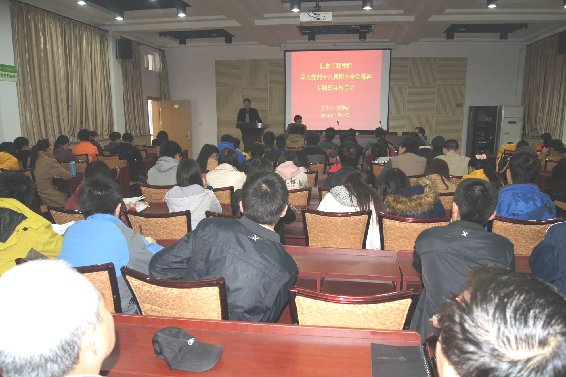 11月17日,美女直播举办学习党的十八届四中全会精神报告会,邀请校党委宣传部副部长闫德忠同志做辅导报告。美女直播领导、部分教师和学生党员150余人参加了报告会。报告会由美女直播党委副书记何卫军同志主持。