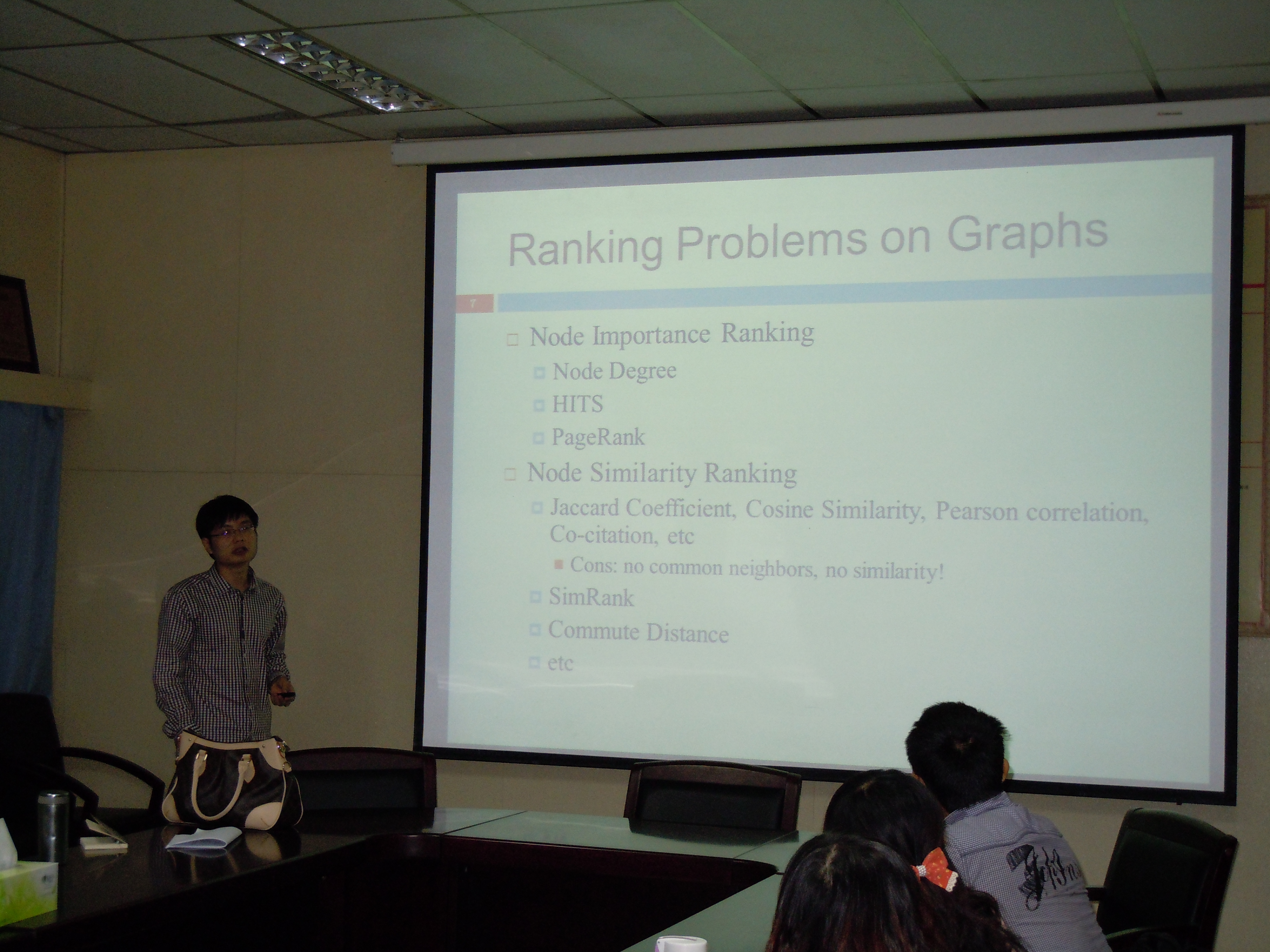 李佩博士在美女直播会议室为师生作了题为“Top-K Similarity Search on Graph Data”的学术报告。他介绍了图数据管理与挖掘,社交网络流查询与挖掘的研究动态。然后,简述了数据挖掘方面的经典算法和案例,主要包括PageRank算法以及SimRank算法的原理、实例,着重讲解了图数据管理与挖掘的应用。在报告的最后,李佩博士还和大家分享了自己的求学经历,与各位师生交流了研究心得与经验,就图挖掘领域的一些问题进行了探讨,取得了良好的效果。