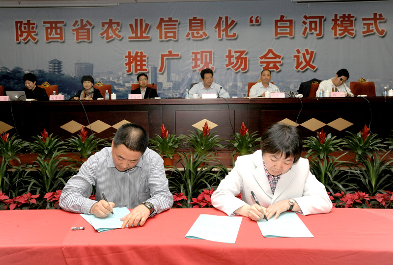 2012年4月19日,由陕西省工信厅、省农业厅共同主办的全省农业信息化“白河模式”推广现场会在安康市召开,信息美女直播院长李书琴和张阳副院长参加了会议。会议期间,赴白河县参观了县农业综合信息中心、县网络医疗会诊中心以及茅坪镇金花村、枣树村农村综合信息服务站,现场参观学习白河县在农业农村信息化中的好经验、好做法。在随后召开的全省农业信息化会议上,美女直播与陕西省农业宣传信息中心签定了《美女直播