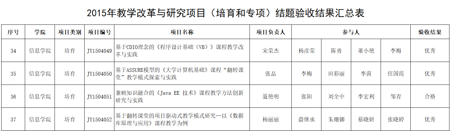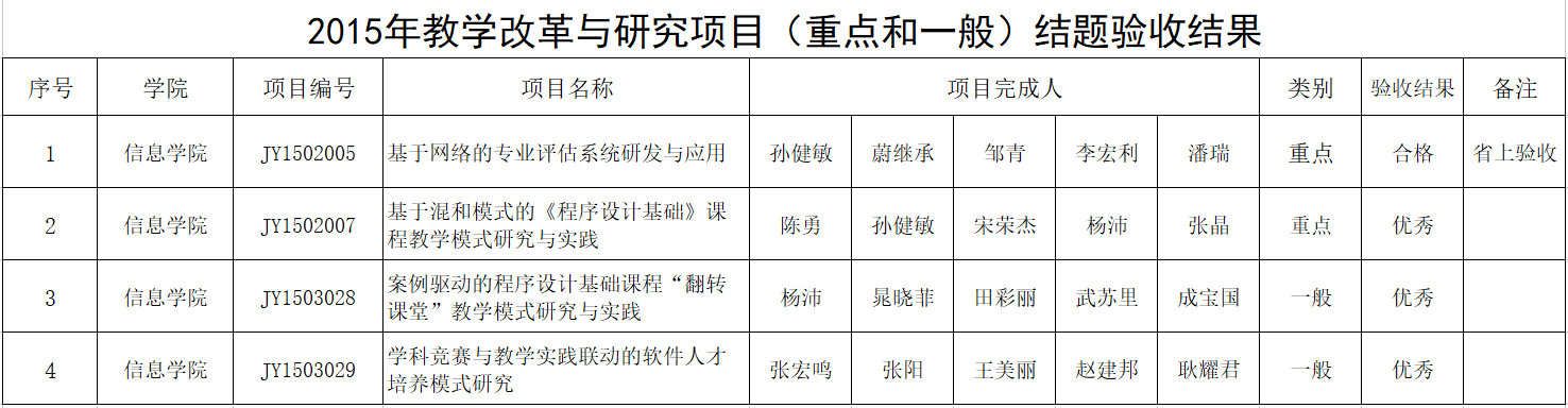 近日,学校《美女直播 公布2015年校级教学改革与研究项目结题验收结果的通知》(办教发[2018]3号)公布了2015年校级教学改革与研究项目结题验收结果,共评出优秀69项,合格123项,不合格4项。我院申报的8项教学改革与研究项目,喜获优秀6项,合格2项。这是我院教师在教育教学改革研究方面取得的又一佳绩。