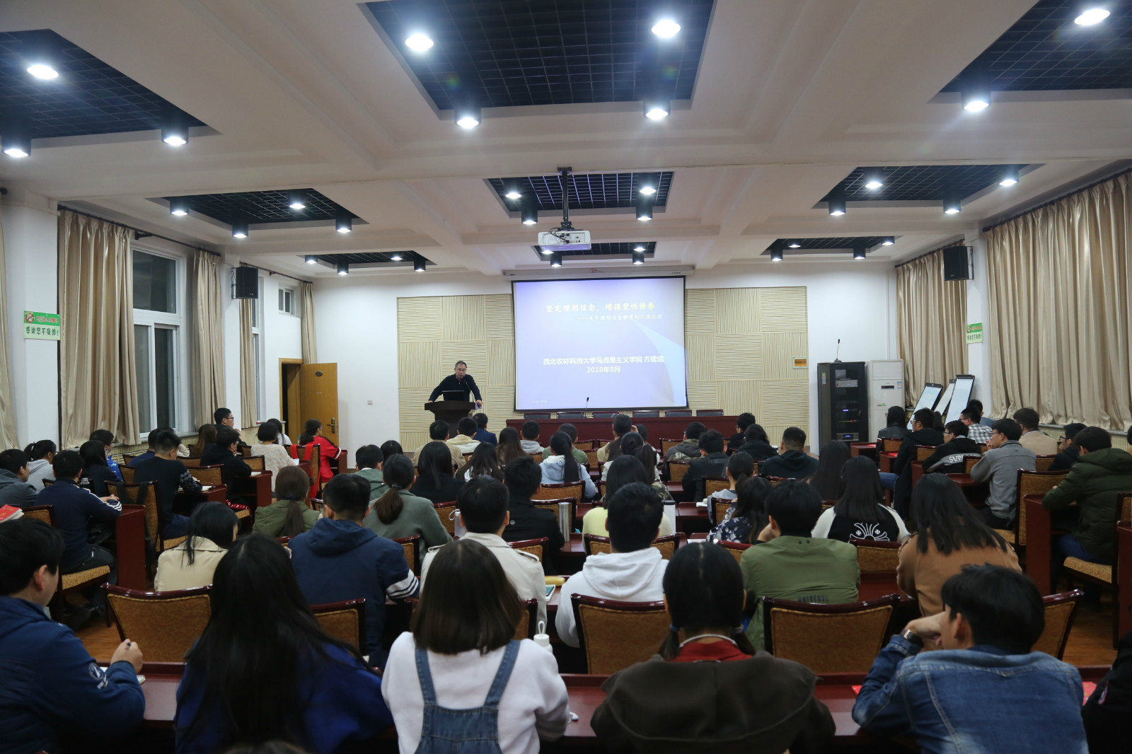 方建斌教授从什么是理想信念、中国人有无信仰、为什么要加强党的基本知识教育以及如何加强理想信念教育等四个方面引经据典,指引我们坚定树立共产主义理想信念,坚持用先进思想武装头脑,重视理论学习,保持理论联系实际优良作风,牢记宗旨、密切联系群众,永筑防腐拒变防线,保持共产党员清廉作风,树立忧患意识,努力成为合格的建设者和接班人。