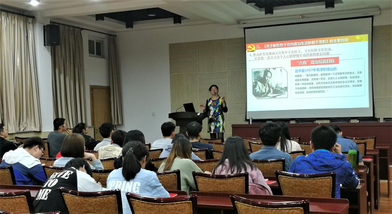 张丽老师从新准则的产生背景讲起,带领学生追溯了改革开放以来八次六中全会的主题和内容,对于十八届六中全会的主题和重要意义做了重点讲解,学生们受益匪浅。在准则的详细讲解部分,张丽老师指出新准则是对1980年制订准则的继承和创新,并结合动画短片、思考讨论及举例说明等多种教学方式,对准则的结构和内容进行了详细的阐释。紧接着,张丽老师用浅显、生动的比喻对于准则的具体要求、规范和重点内容再次讲解。并对在座的大学生提出殷切的期望,希望我们刻苦学习习近平新时代中国特色社会主义思想,坚定理想信念;维护党中央权威,与党中央保持高度一致;服务身边同学,为中国特色社会主义经济、政治、文化、生态建设贡献自己的微薄力量。