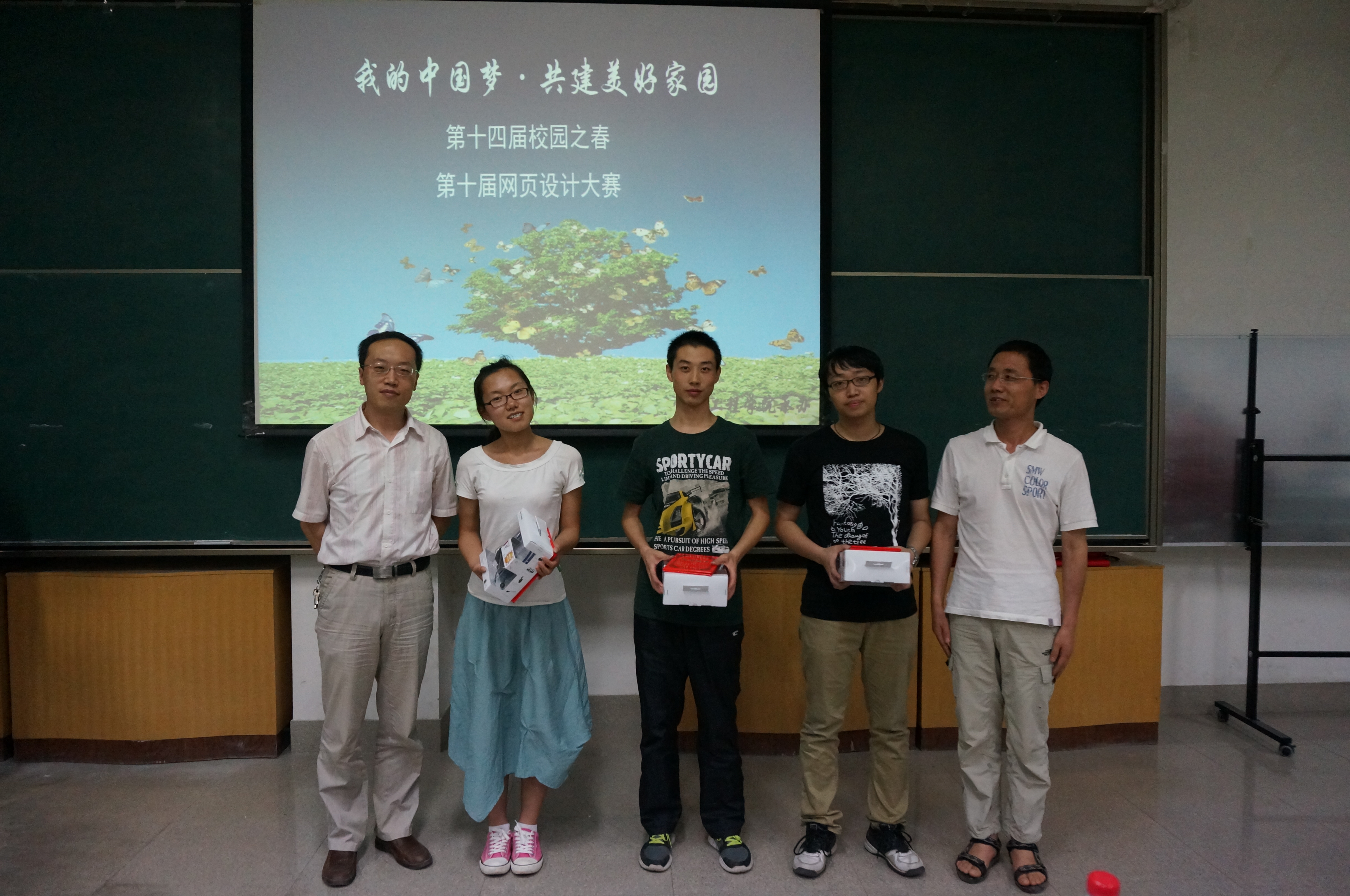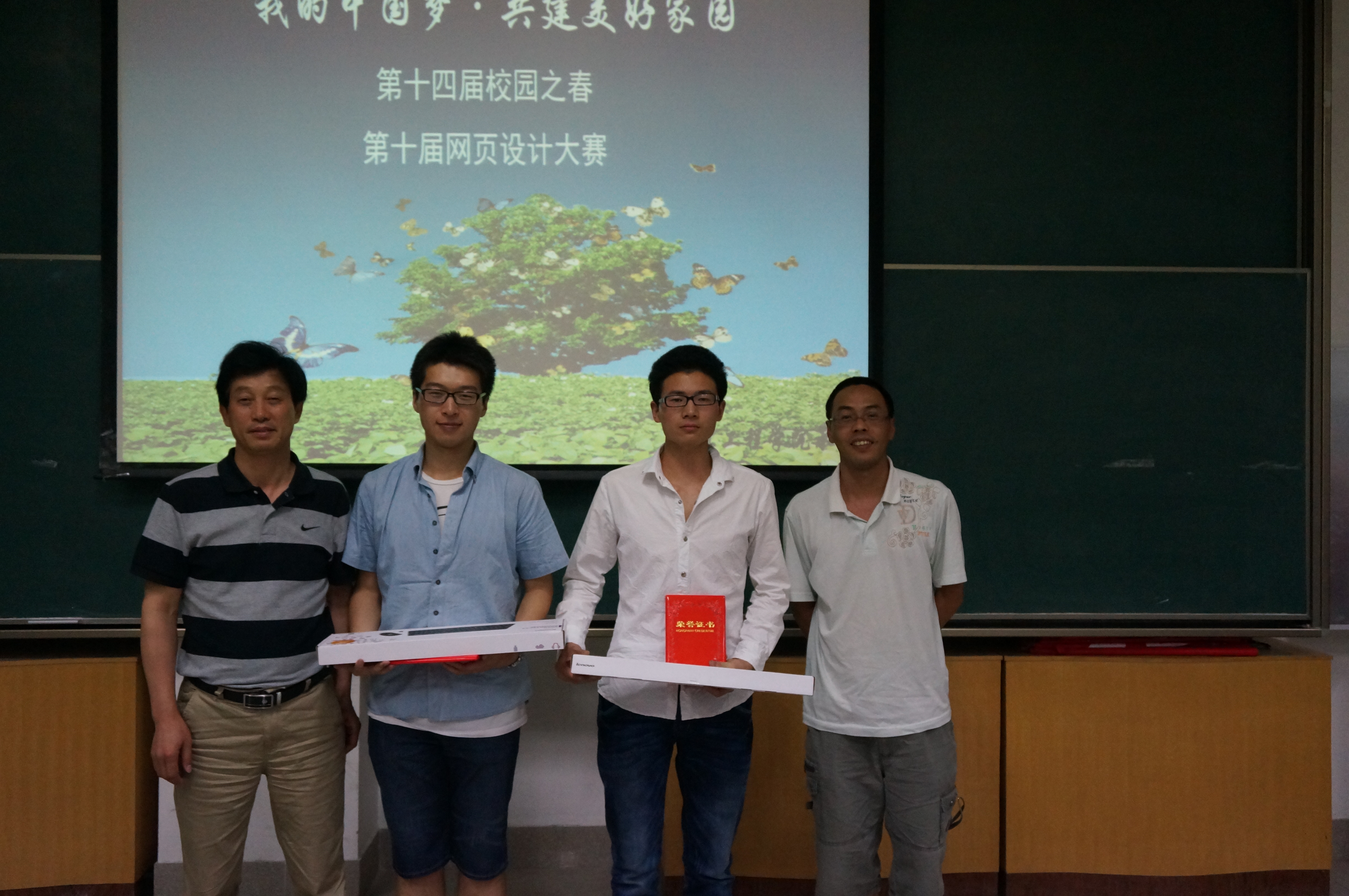 经过激烈的竞争和评委的认真评选,来自信息美女直播周江同学的《信息服务联盟供求系统》凭借其优秀的制作技术,良好的后台操作一举获得大赛一等奖;陈金亚同学的《个人心情日记本》以及张文康、夏旭同学的《共建美好家园》获得二等奖;获得三等奖的作品有《中奥环境研究保护中心》,《中国梦??共建美好明天》,《环保部落》。