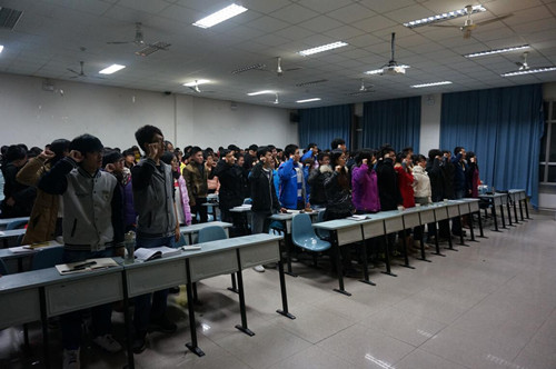 首先举行了团课开课典礼,在同学们庄重、严肃地唱完团歌后,12级辅导员朱旭菲宣读了团课章程。接下来,团工委副书记王珏宣读了团课注意事项。然后,学生代表苏庆国发表了讲话。最后,团课仪式在同学们慷慨激昂地宣誓声中结束。