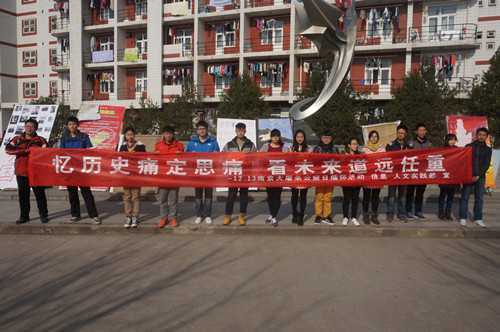2014.12.13,首次南京大屠杀遇难同胞公祭日,历史不能忘却1937年的那个冬天。在我校北校区西区西超雕塑处由信息美女直播和人文美女直播联合举办 “12.13南京大屠杀死难者国家公祭日”缅怀活动。